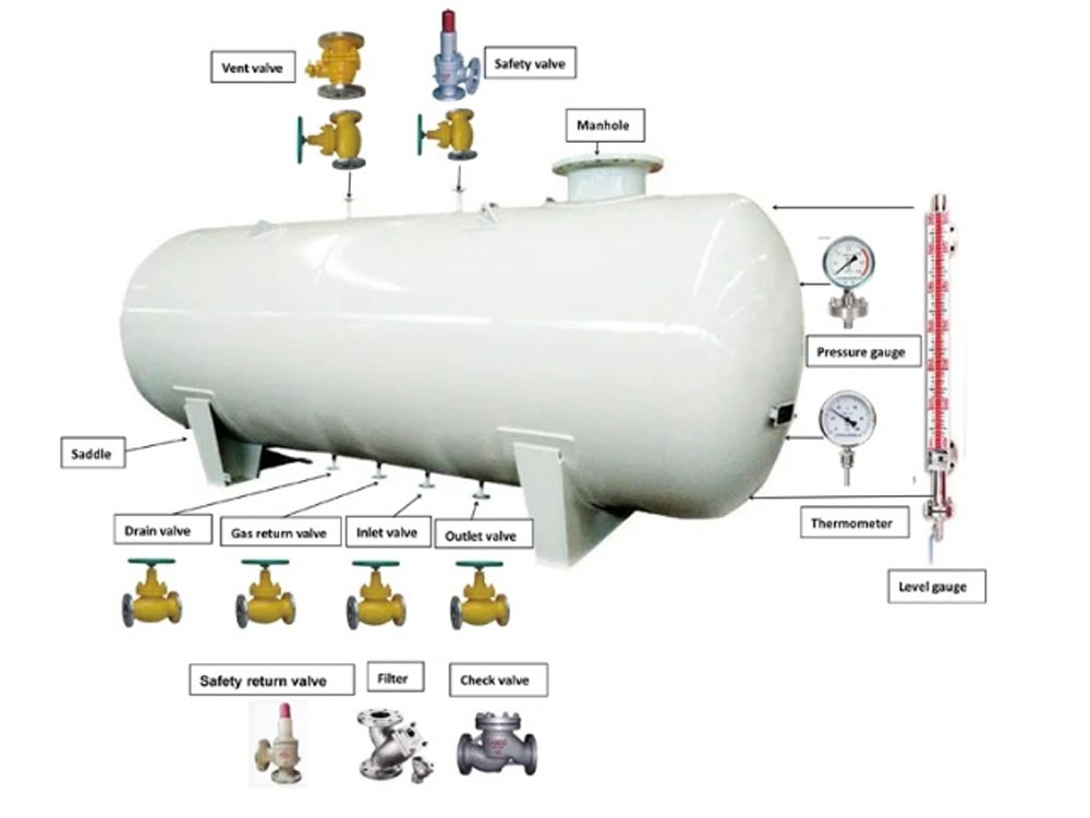 LPG storage tanks consist of four main parts: the tank body, the tank lid, the venting system, and the tank base. More specifically, the tank structure includes: